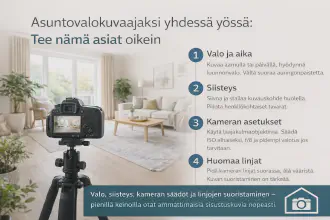 Ensinnäkin, älä raahaa paikalle kahdeksan kilon studiovaloja tai kolmijalkaa, joka muistuttaa erehdyttävästi kosketinsoittajan telinettä. Hyvä järjestelmäkamera tai jopa laadukas nykypuhelimen kamera riittää, kunhan valaistus on kohdillaan. Asuntokuvauksen ytimessä on valolla leikkiminen, ja siinä luonnonvalo on paras ystäväsi. Ikkunat auki, verhot sivuun ja mahdollisimman paljon valoa sisään – ilman, että ylivalotat ikkunanäkymät puhki.